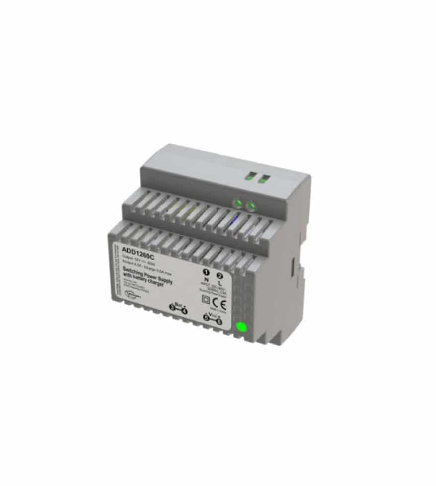 La fuente de alimentación conmutada modular para instalar en carril DIN y que ocupa 5 módulos, transforma una tensión de entrada de 230 V CA (220 a 240 V) en 12 V CC en la salida. Puede alimentar ventosas, tiras, cerraderos y lectores de proximidad con una intensidad máxima de 4,5 A / 60 W. Particularidad de este modelo, dispone de salida de cargador directamente en el módulo para conectar una batería en caso de corte de energía, para mantener los dispositivos enchufados, hasta que sea normal.