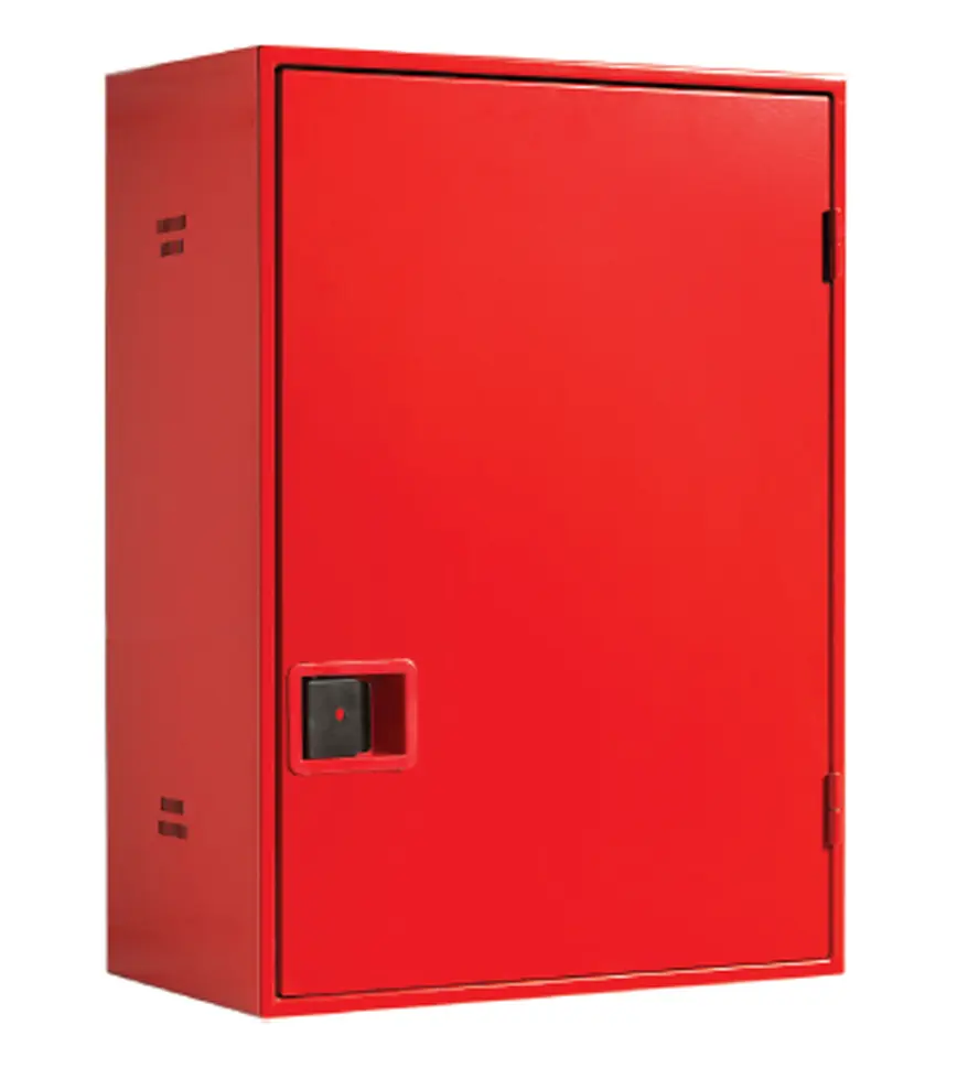 Armario vertical construido en chapa de acero de 1 mm de espesor, pintado en color rojo RAL 3000, de medidas 476 x 660 x 260 mm, con puerta ciega pintada del mismo color, provisto de pretaladro para la entrada de alimentación, manguera, lanza, válvula de asiento, manómetro y latiguillo de alimentación.