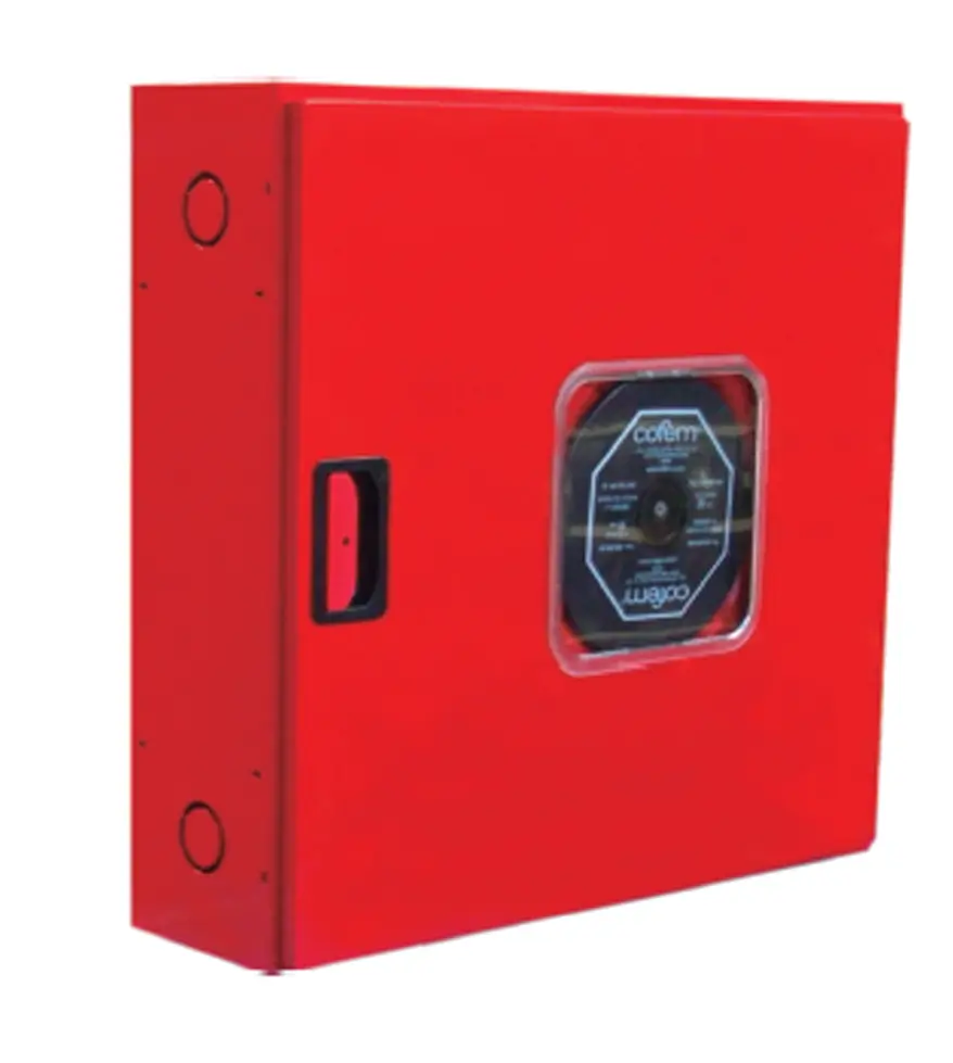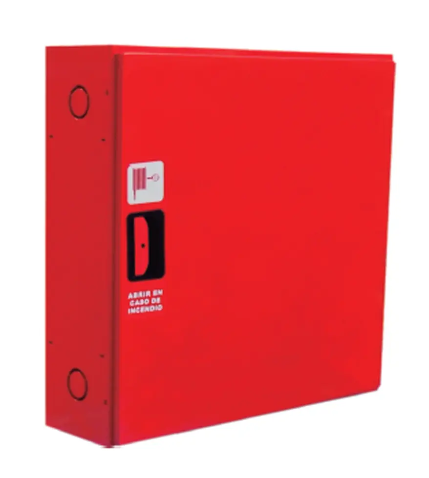 Está compuesta por armario horizontal construido en chapa de acero de 1 mm de espesor, pintado en poliéster color rojo RAL 3000, de medidas 680 x 650 x 180 mm, con cerradura de apertura rápida fabricada en plástico ABS, provisto de pretaladros para la entrada de alimentación, manguera, lanza, válvula de asiento, manómetro y latiguillo de alimentación.