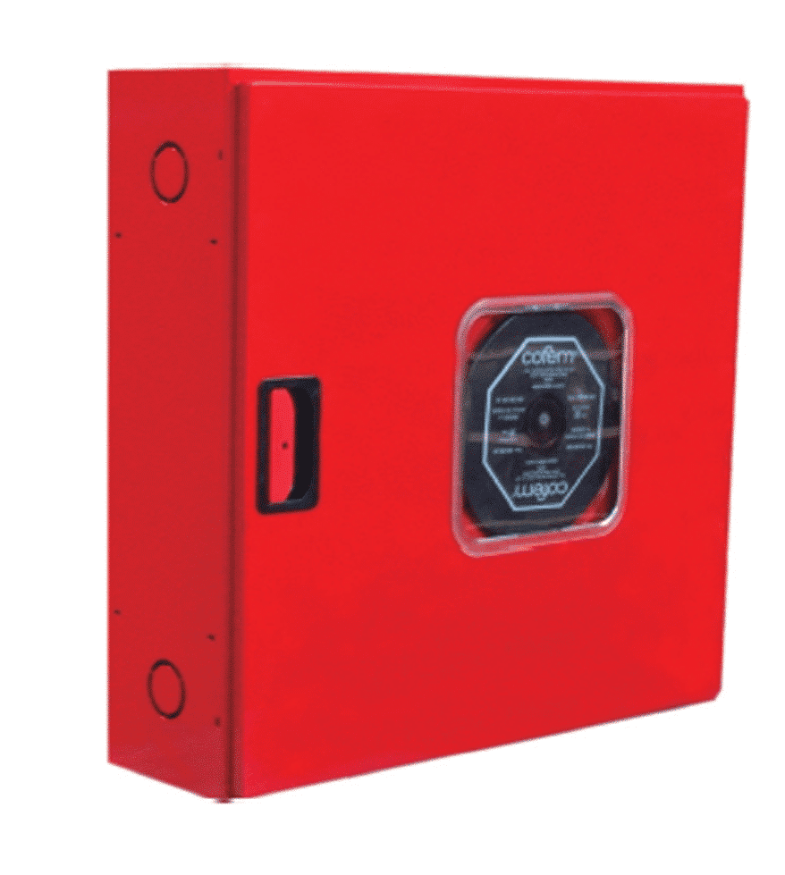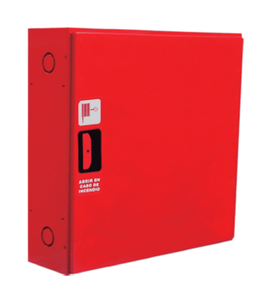 Está compuesta por armario horizontal construido en chapa de acero de 1 mm de espesor, pintado en poliéster color rojo RAL 3000, de medidas 680 x 650 x 180 mm, con cerradura de apertura rápida fabricada en plástico ABS, provisto de pretaladros para la entrada de alimentación, manguera, lanza, válvula de asiento, manómetro y latiguillo de alimentación.