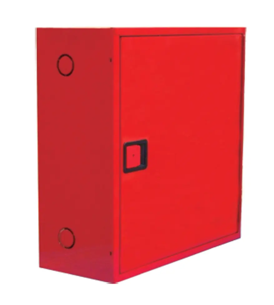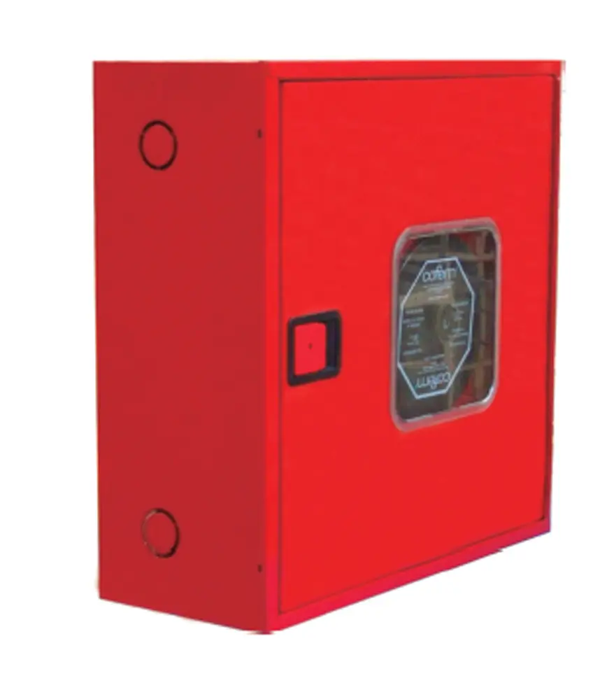 Está compuesta por armario horizontal construido en chapa de acero de 1 mm de espesor, pintado en poliéster color rojo RAL 3000, de medidas 620 x 620 x 245 mm, con cerradura de apertura rápida fabricada en plástico ABS, provisto de pretaladros para la entrada de alimentación, manguera, lanza, válvula de asiento, manómetro y latiguillo de alimentación.