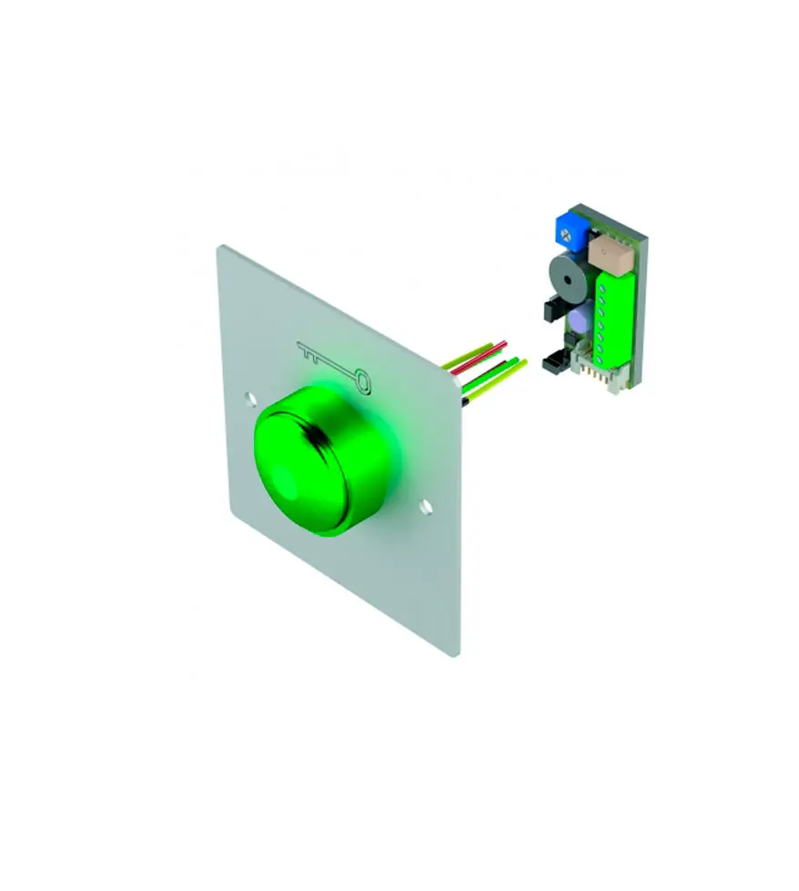 Pulsador ancho tipo hongo – Sewosy. Pulsador Retardo con tiempo ajustable 0-60 segundos, con led de apertura y señal acústica regulable.