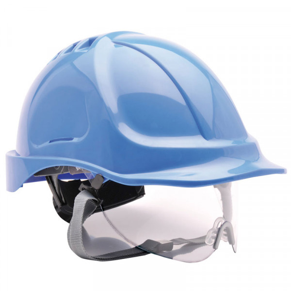 Casco de seguridad con gafa abatible integrada en el propio casco. Ventilación superior y cómodo arnés textil de 6 puntos de fijación. Referencia 08148PW55ESTAZ