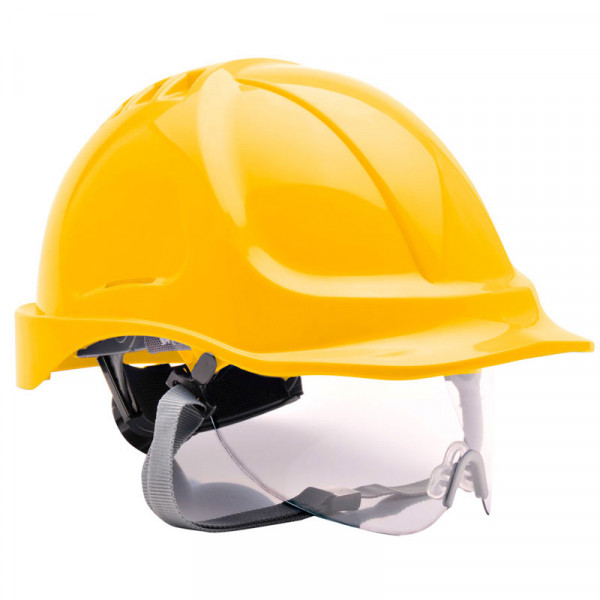 Casco de seguridad con visor transparente abatible integrado en el mismo casco. Perforaciones superiores para mayor ventilación. Referencia 08148PW55ESTAM