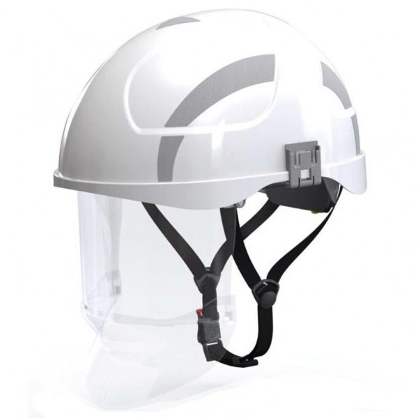 Casco de seguridad Secra-1 aislante eléctrico con visor abatible integrado. Barboquejo integradao para mayor sujeción. Referencia 0832SECRAT