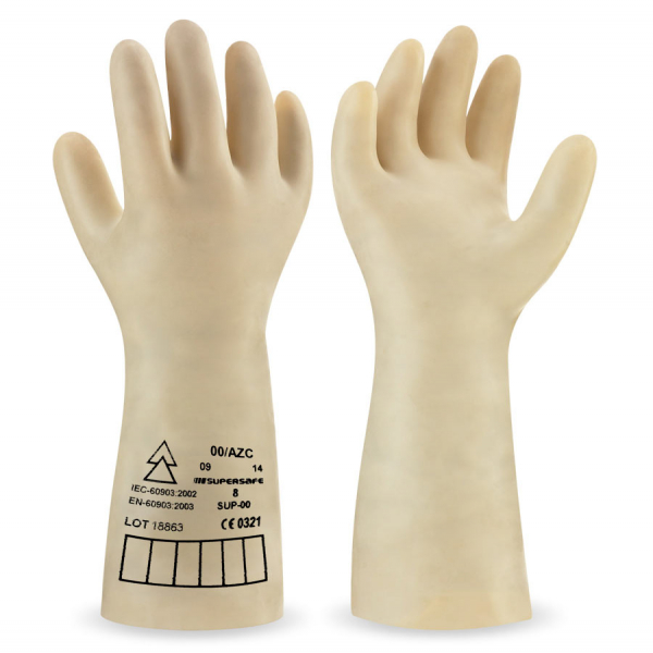Guantes dieléctricos aislantes a la electricidad hasta 26500V. Fabricados en látex natural sobre soporte Interlock de algodón. Referencia 0610DIELE3