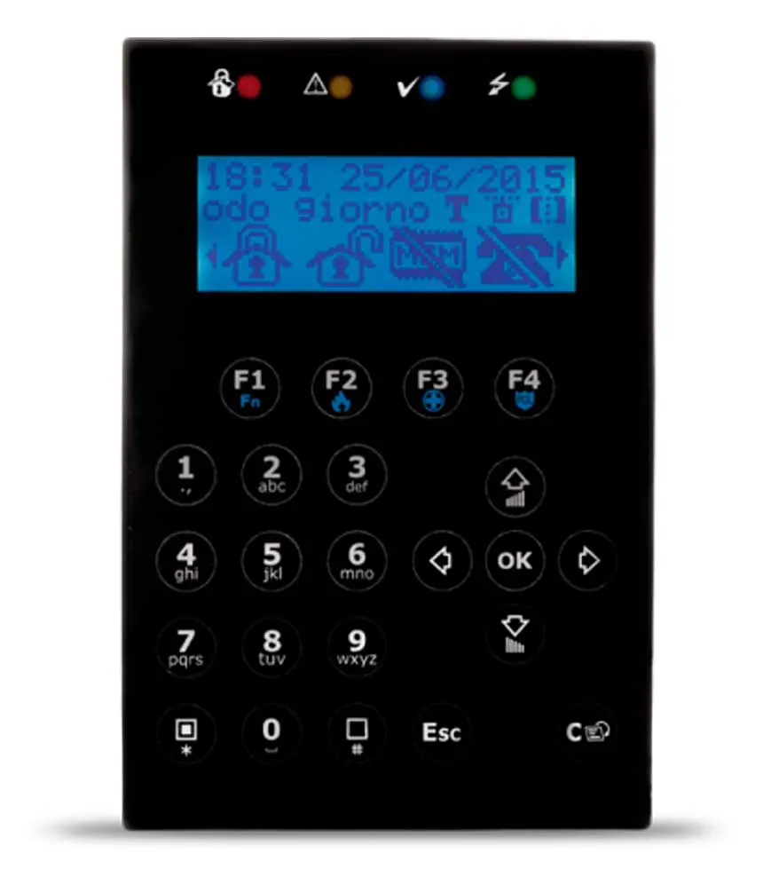 Las teclas táctiles están siempre a la vista, lo que garantiza la constante accesibilidad a todas las funciones. Junto a la pantalla gráfica hay 4 teclas de función que permiten una simple activación de las funciones de la central y que, cuando se utilizan en pares, también sirven como alarmas inmediatas.