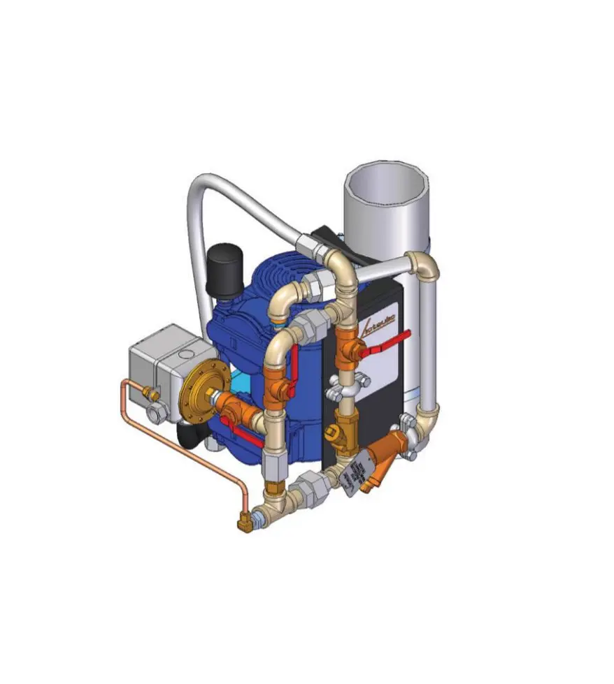 El conjunto está conformado por un compresor montado en el conducto ascendente, un dispositivo de mantenimiento de aire Serie 757P y mangeras flexibles para la instalación. Está diseñado para que el sistema de válvulas alcance una presión operativa de aire en un plazo de 30 minutos desde la descarga.