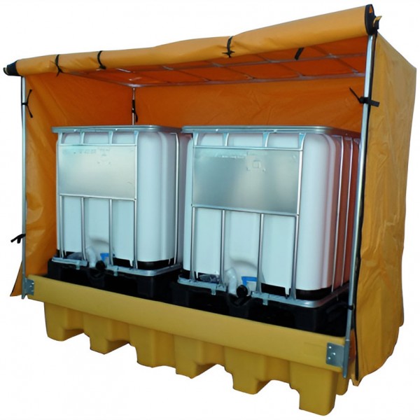 Cubeto de retención para 2 bidones IBC de 1000 litros con toldo de protección, adecuado para uso en exteriores.