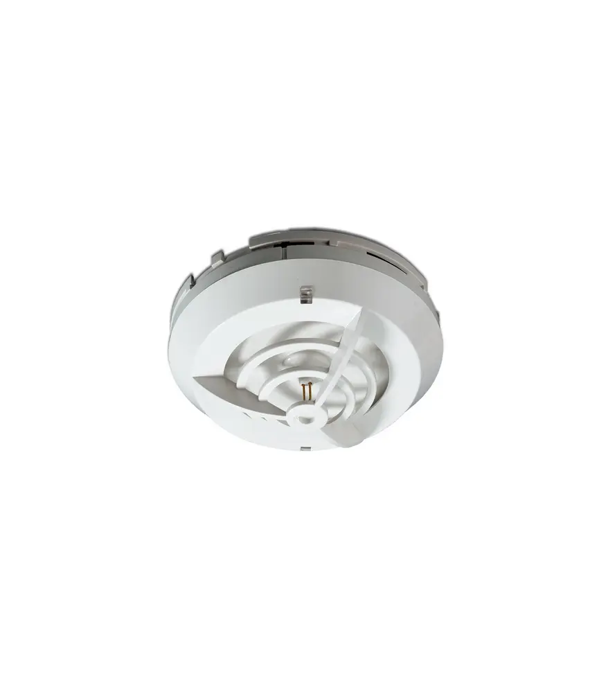Detector termovelocimétrico analógico algorítmico con microprocesador y direccionamiento digital de bajo perfil, lectura de la temperatura en tiempo real, doble led indicador con visión total, salida para piloto remoto y sistema antihurto de la cabeza, material ABS color blanco.