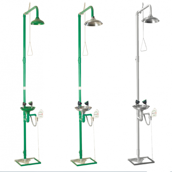 Ducha con lavaojos de emergencia fabricada en acero galvanizado, acero inoxidable o en acero galvanizado e inoxidable.