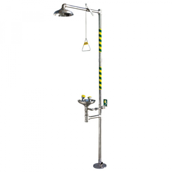 Ducha lavaojos de emergencia fabricada en acero inoxidable.