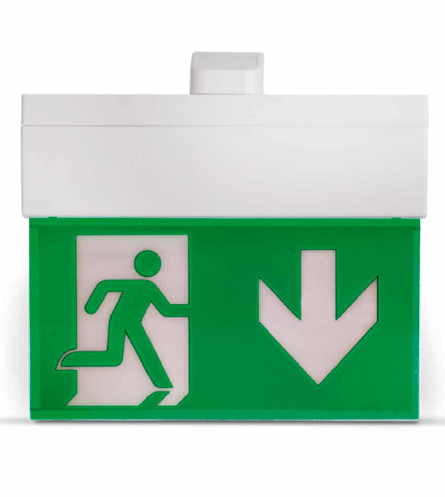 Iluminación de señalización para vías de evacuación, compacta y flexible, un solo cuerpo para todas las variantes de montaje. Visibilidad 20 metros, símbolos que cumplen con la norma internacional ISO7010.