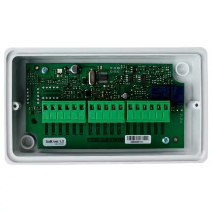 El módulo está montado en una pequeña caja de plástico separada adecuada para montaje en la pared, con tapa transparente para inspección visual.