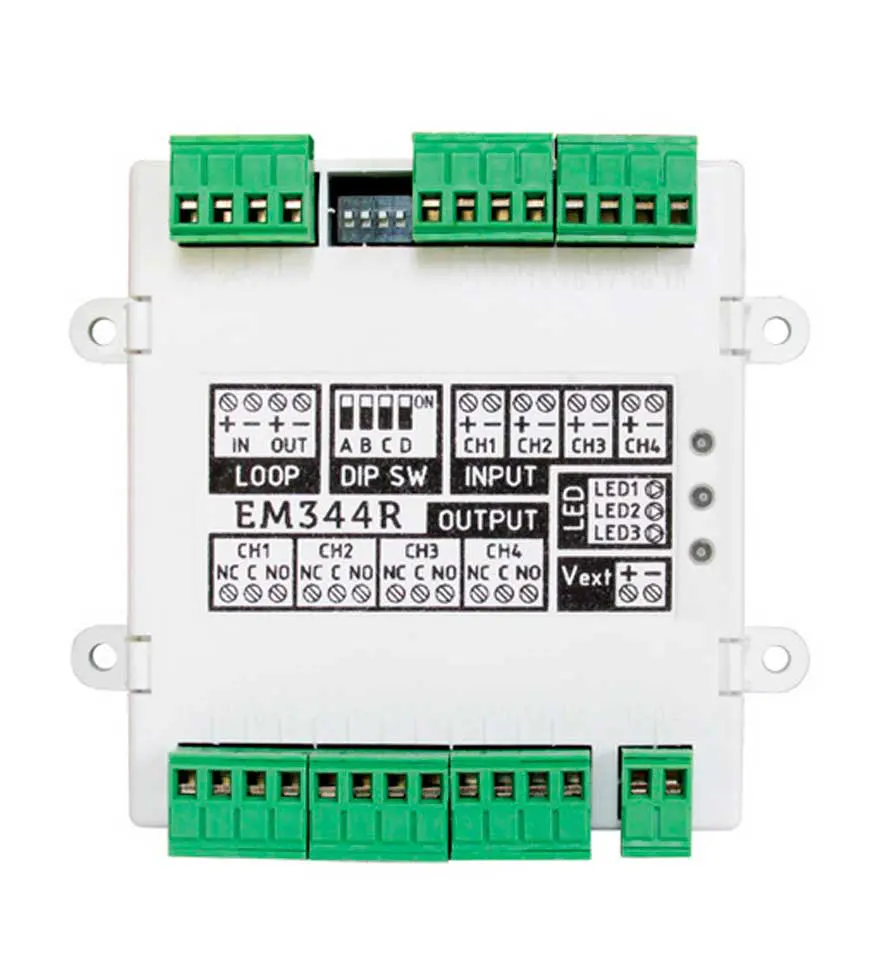 Módulo de 4 entradas/4 salidas y 2 entradas convencionales con aislador EM344S / Inim Electronics. Direccionamiento automático