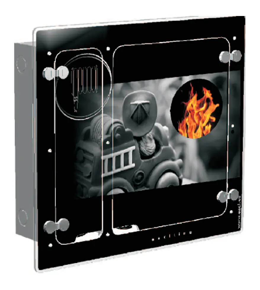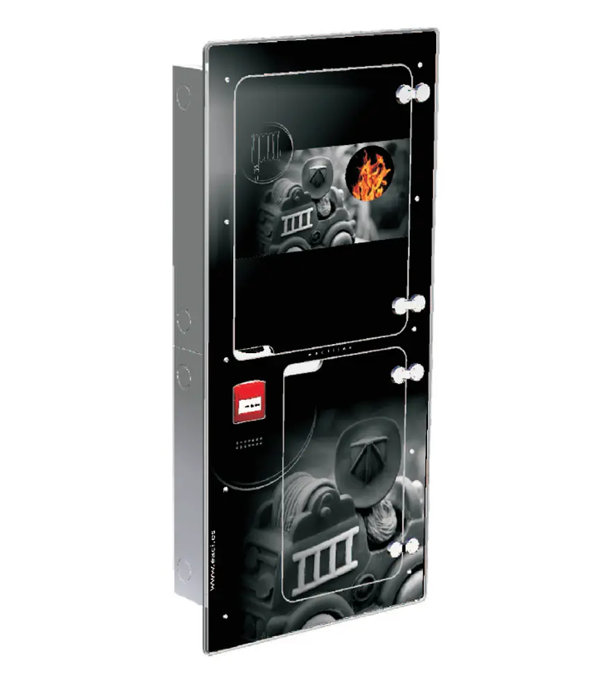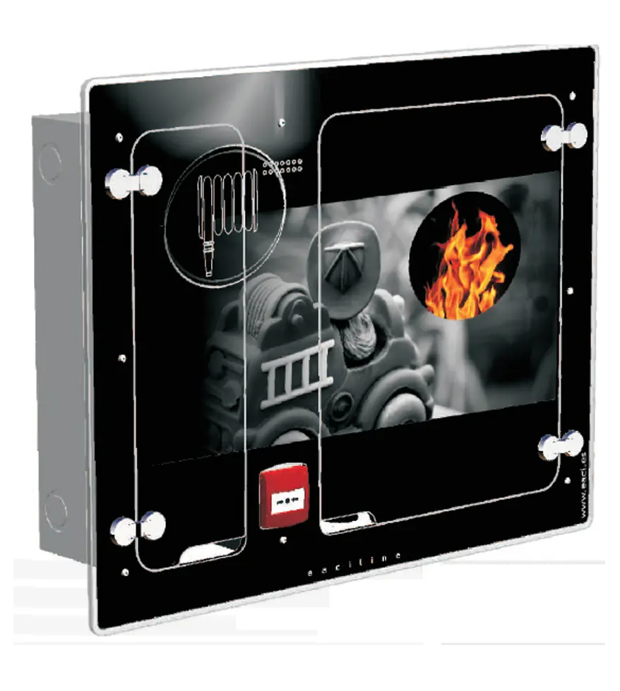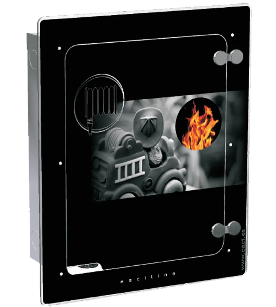 Panel decorativo en metacrilato para BIE + Armario extinor + Pulsador alarma. Modelo EACILINE del fabricante EACI.