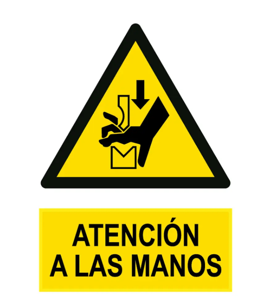 Señal / Cartel de Atención a las manos. Homologada. Según UNE 81-501. PVC 0,7 mm, 2 mm. Aluminio 0,8 mm y Adhesivo. Varios tamaños.