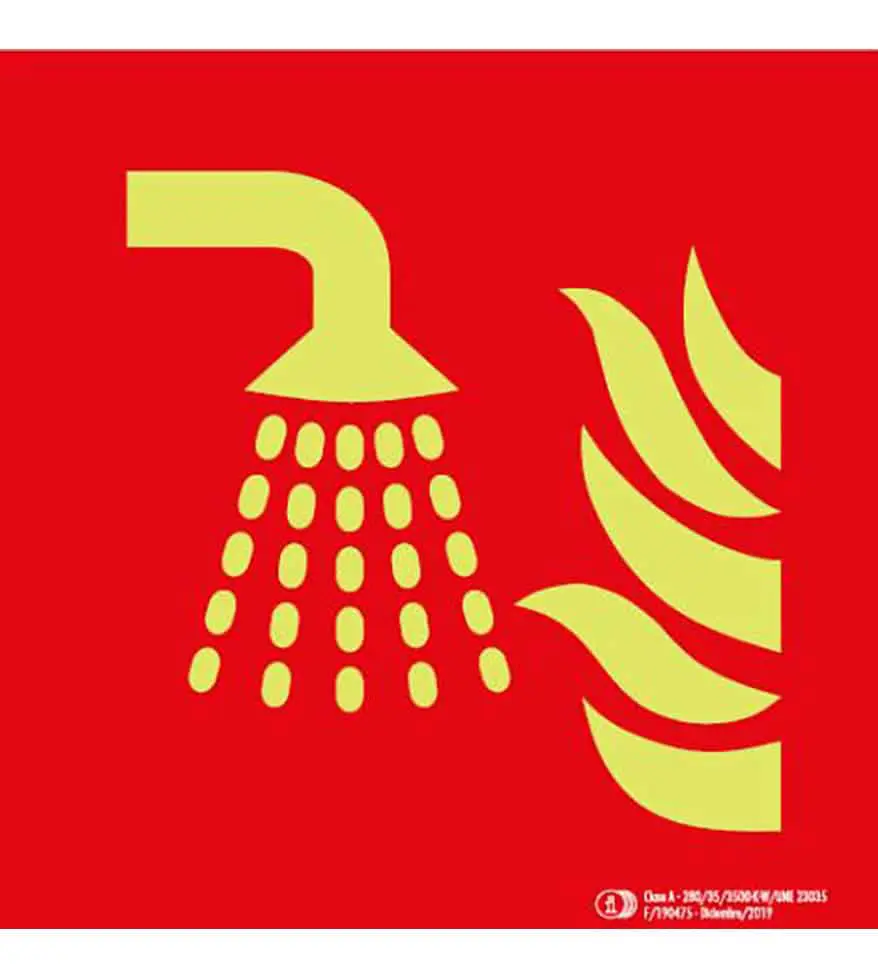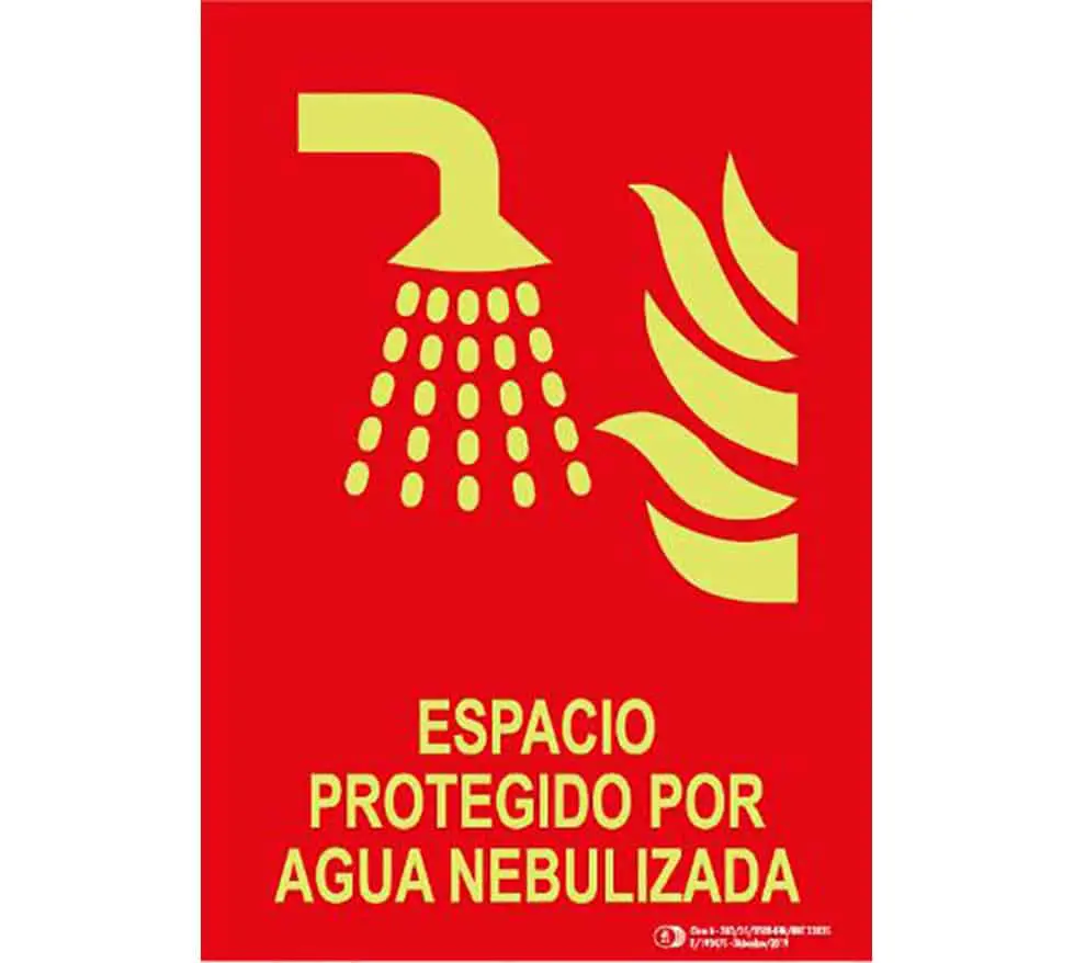 Señal de Espacio protegido por agua nebulizada. Clase A. Luminiscente. Segun UNE 23035:2003. Disponible en PVC 1 mm.