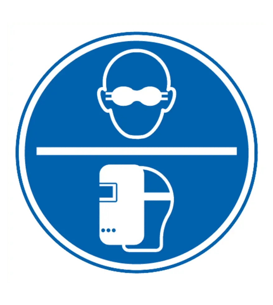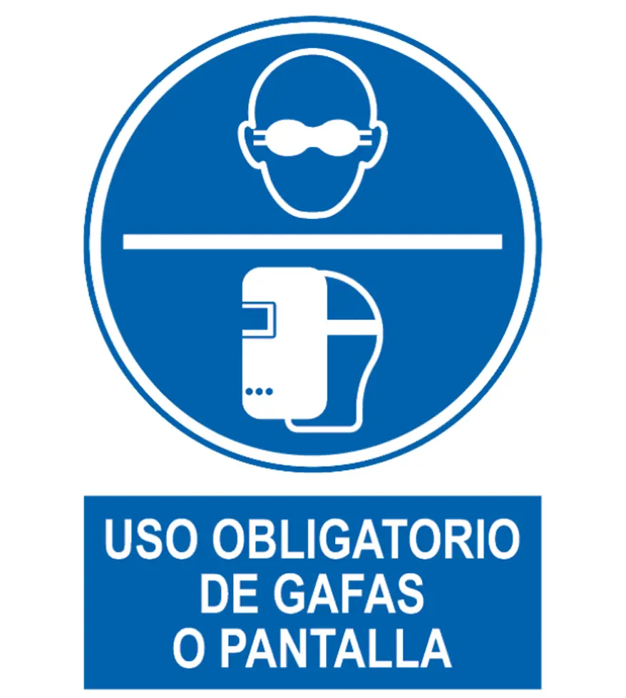 La señal de Uso obligatorio de gafas o pantalla está disponible en material Adhesivo, PVC 0,7 mm, PVC 2 mm y Aluminio 0,8 mm. También tiene varios tamaños a elegir para este mismo producto.