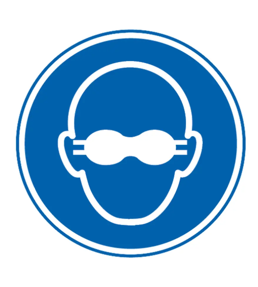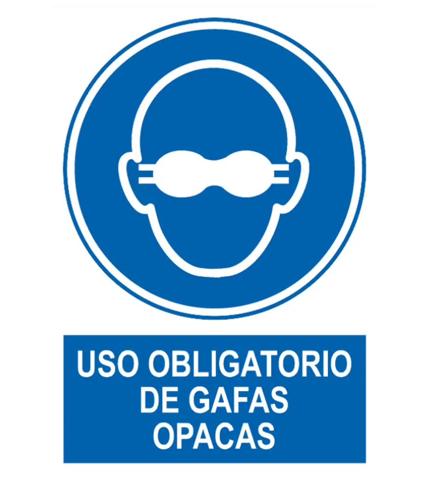 Señal / Cartel de Uso obligatorio de gafas opacas. Homologada. Según UNE 81-501. PVC 0,7 mm, 2 mm. Aluminio 0,8 mm y Adhesivo. Varios tamaños.