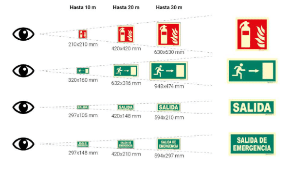 – Según la UNE 23033 / ISO 7010: Podremos comprobar en el código técnico de edificación las diferentes medidas / tamaños de las señales respecto la distancia de observación.