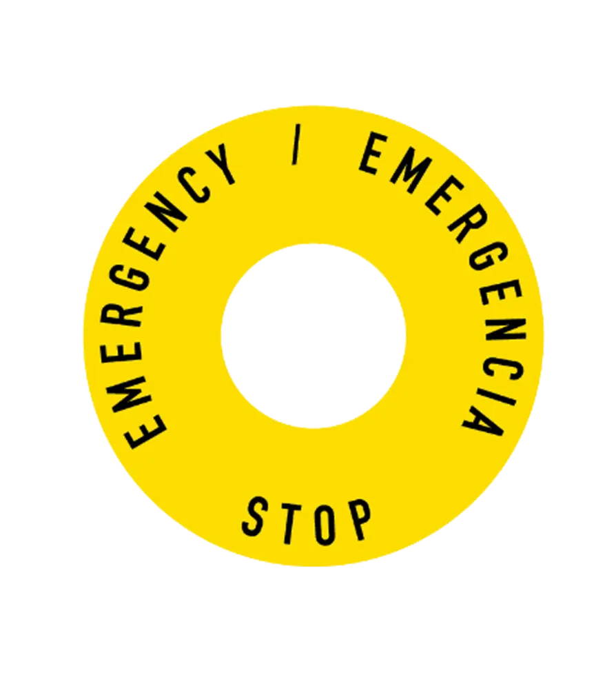 La señal de Botonera. Stop Emergency / Emergencia está disponible en PVC 0,3 mm, serigrafiado y de medidas Ø24 int, Ø60 ext (mm).
