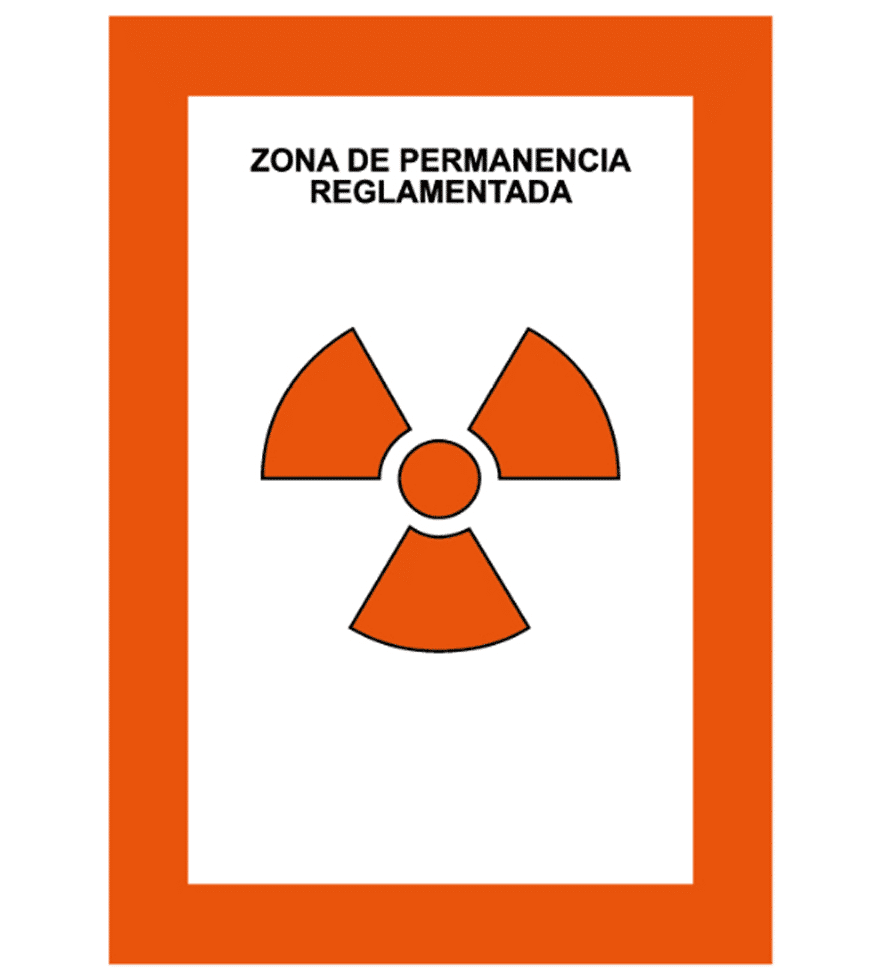 La Zona de permanencia reglamentada es la zona en la que existe el riesgo de recibir em cortos periodos de tiempo una dosis superior a los límites de dosis.. Se señaliza con un trébol naranja sobre fondo blanco.