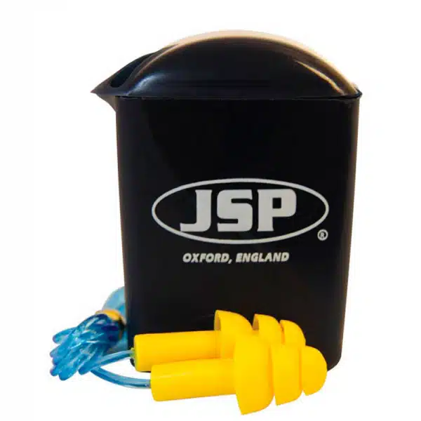 Protector auditivo JSP reutilizable, con estuche transportador y cinta para que no sean extraviados. Estos tapones son reutilizables. Referencia 10218MAXIF