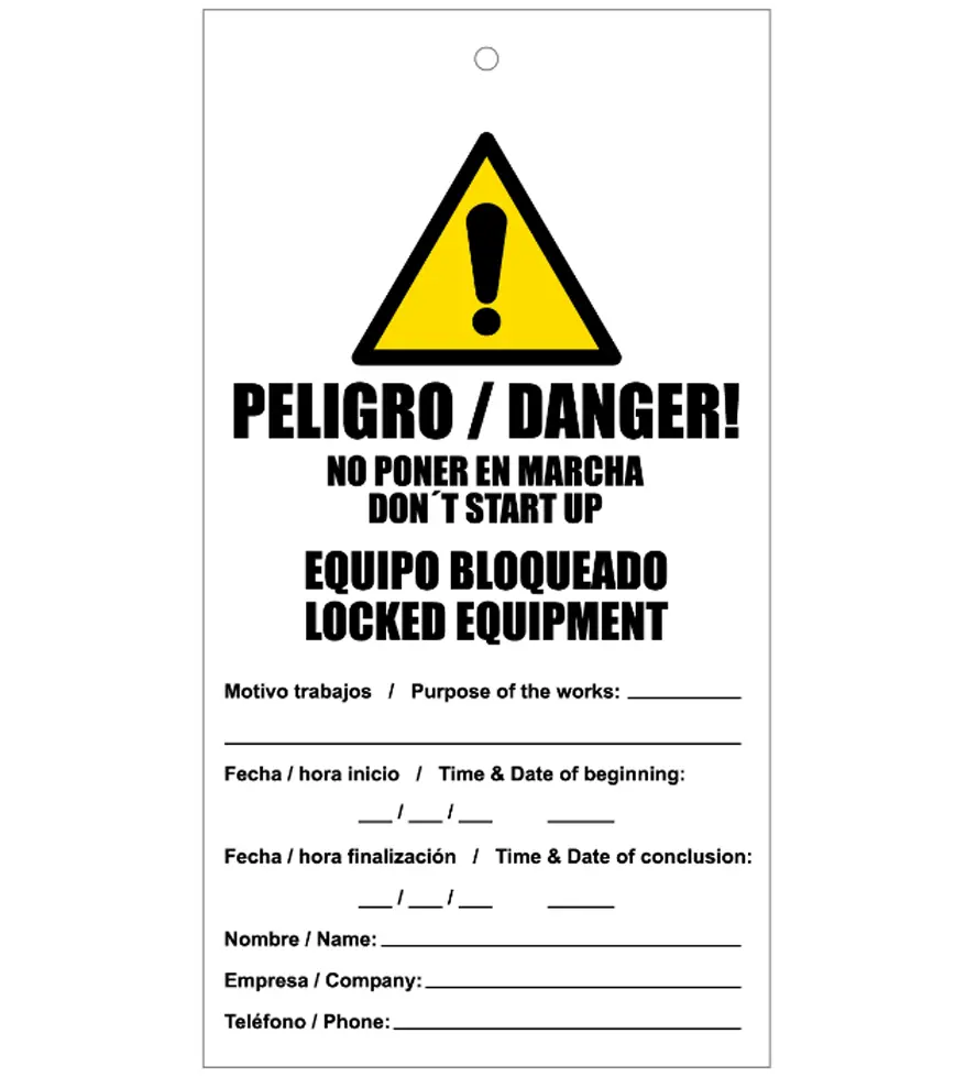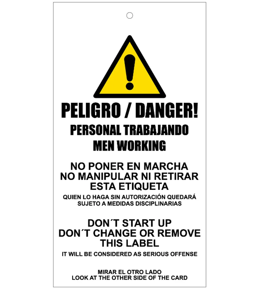 La Tarjeta de bloqueo de Peligro. Personal trabajando está disponible en material PVC 0,3 mm. Medidas 200×100 mm. A dos cara.