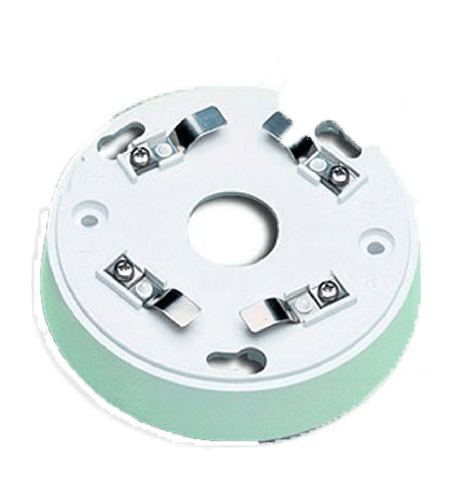 Zócalo / base para detector fabricados en ABS dotados con contactos de bayoneta, tuercas y arandelas para la conexión de los cables, todo en acero inoxidable.